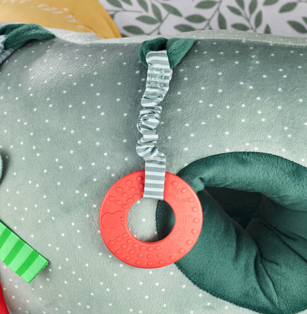 2 in 1 : combines awakening and comfort! Comfort : A padded foam baby seat. Awakening : with activities to stimulate baby’s senses:—- Teething ring Mirror Bells Crumpled paper Textured materials (velvet, satin, …) Washable surface.