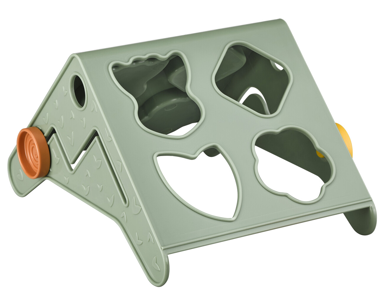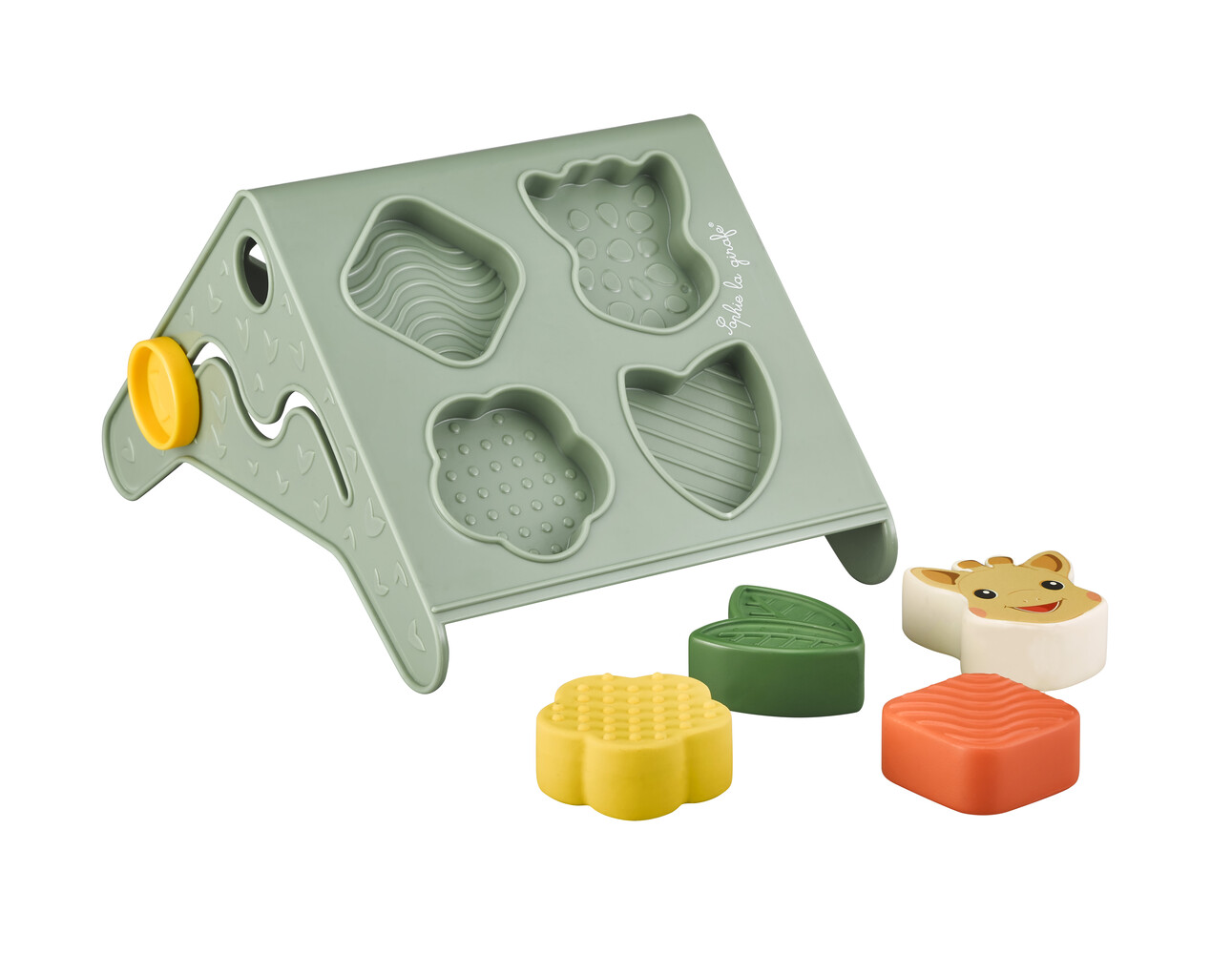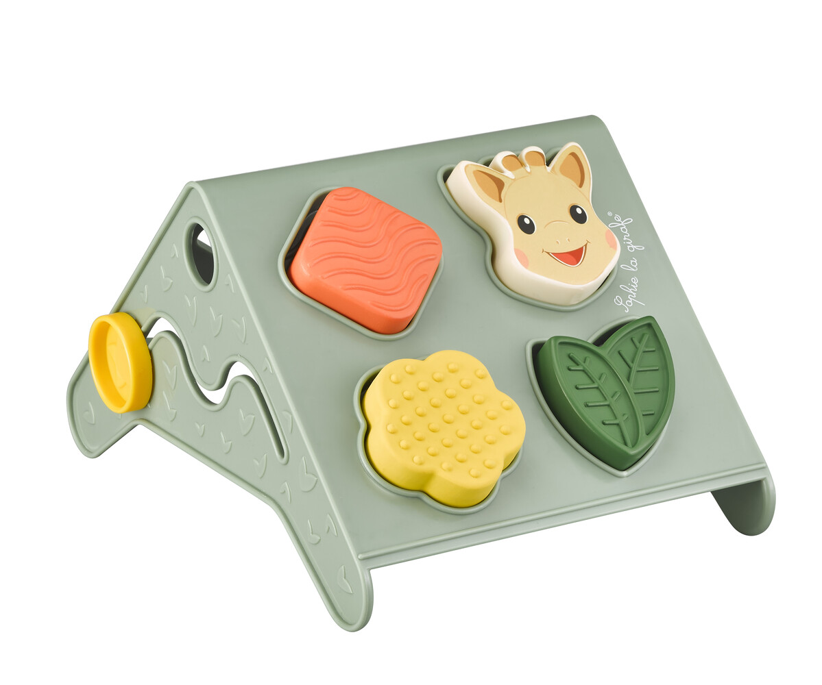 – A 2-in-1 shape sorter: a shape sorter on one side and a nesting game on the other, with sliders to manipulate on the sides. Perfect for entertaining baby and encouraging them to solve small, playful challenges.