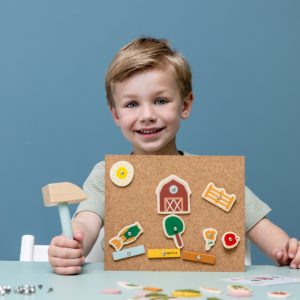 Let your little one create endless farmyard adventures by “nailing” the tractor, barn, animals, and more onto the cork board with this charming wooden hammer set.