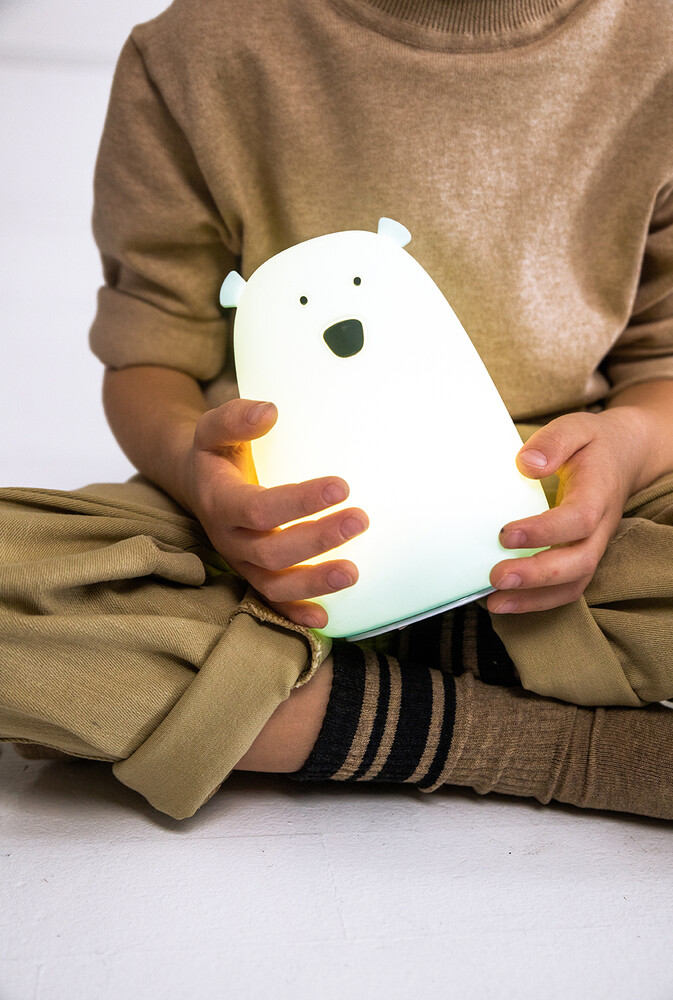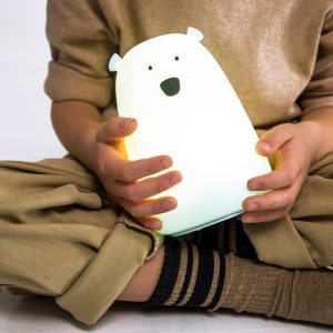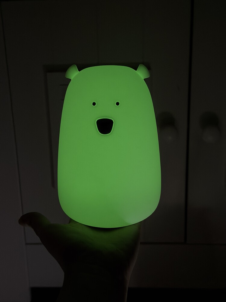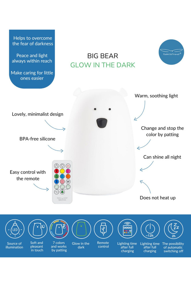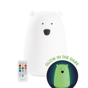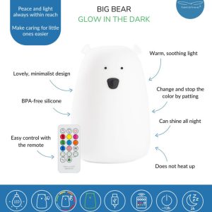 Silikoninen Big Bear yövalo, jossa on pimeässä hohtava ominaisuus. Altistettuaan luonnonvalolle tai keinovalolle, Karhu hohtaa lempeästi pimeässä jonkin aikaa, mikä lisää sen viehätystä, vaikka valo olisi sammutettu. Monitoiminen kaukosäädin mahdollistaa kätevän käytön etäältä.
