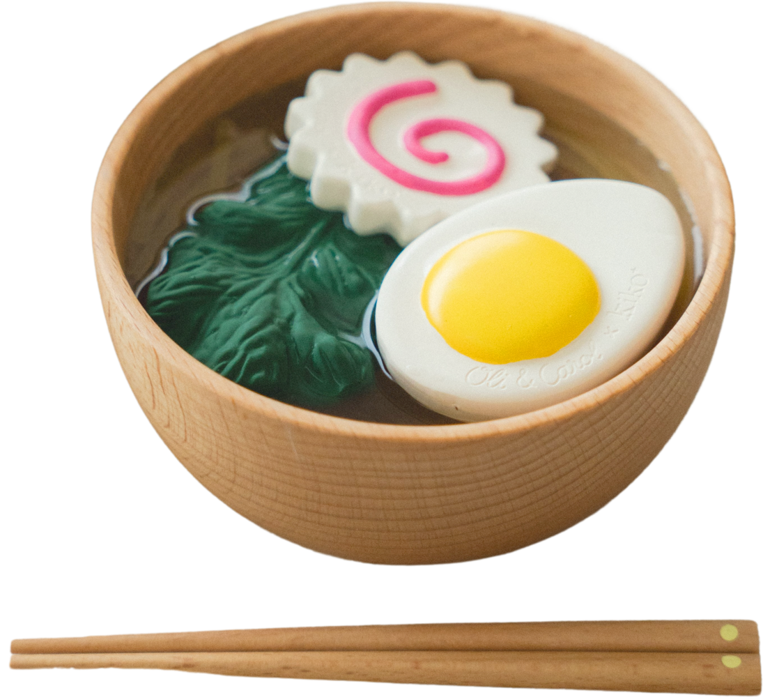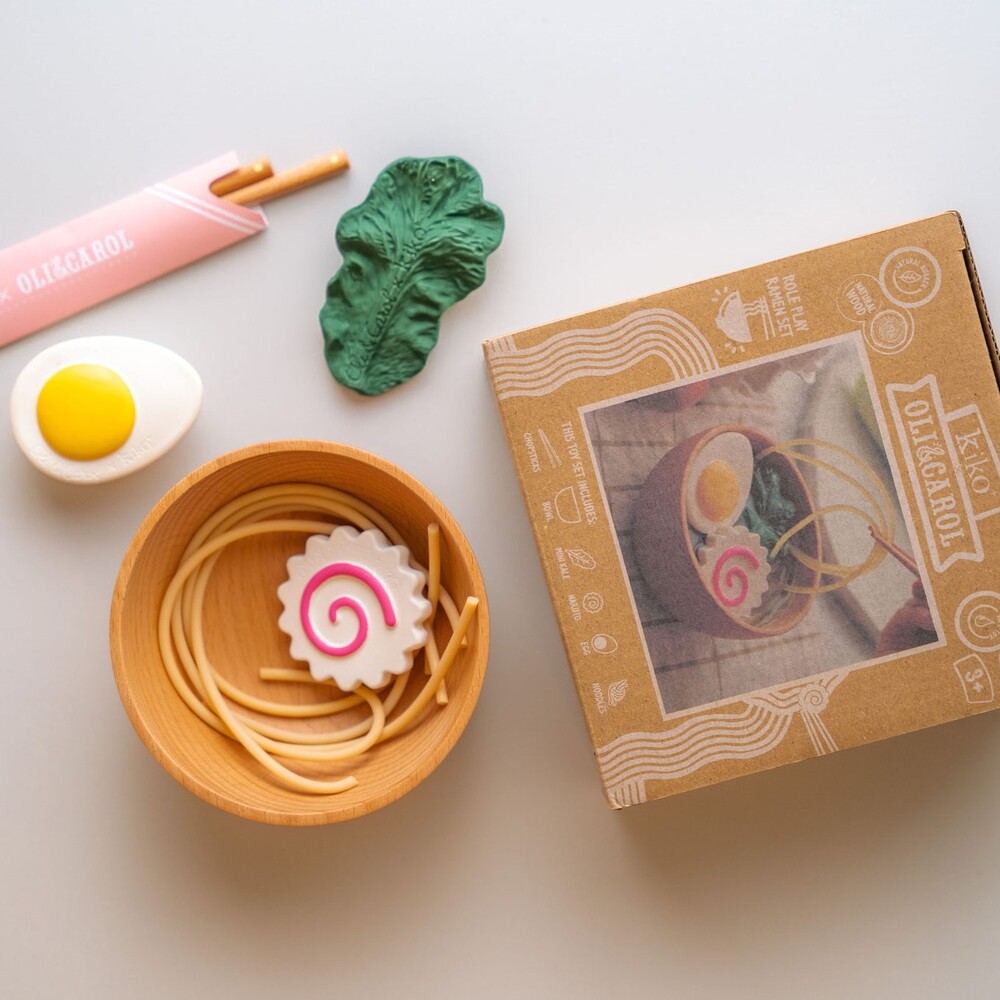 Oli&Carol Ramen Bowl on neljän luonnonkumilelun ja puukulhon setti, joka on suunniteltu aistien stimulointiin ja mielikuvitusleikkeihin. Värikkäät ja monipuoliset lelut kannustavat oppimaan leikin kautta. Tämä setti on osa Oli&Carolin yhteistyömallistoa Kikon kanssa!