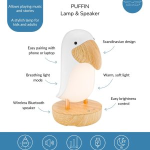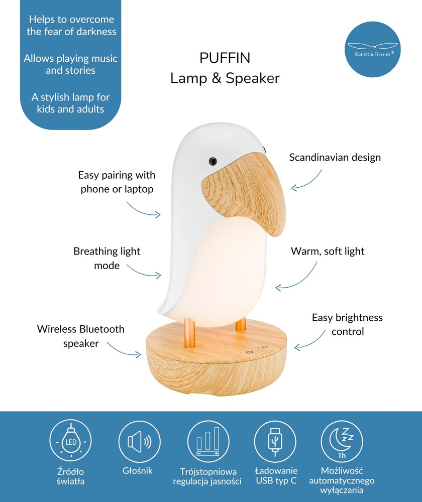 Rabbit & Friends Puffin -yölamppu valaisee ympäristönsä lämpimällä ja ystävällisellä valolla. Sen avulla lapset voivat kuunnella lempimusiikkiaan tai iltasatujaan milloin ja missä tahansa. Sen lohduttava läsnäolo auttaa heitä tuntemaan olonsa turvalliseksi yöllä.