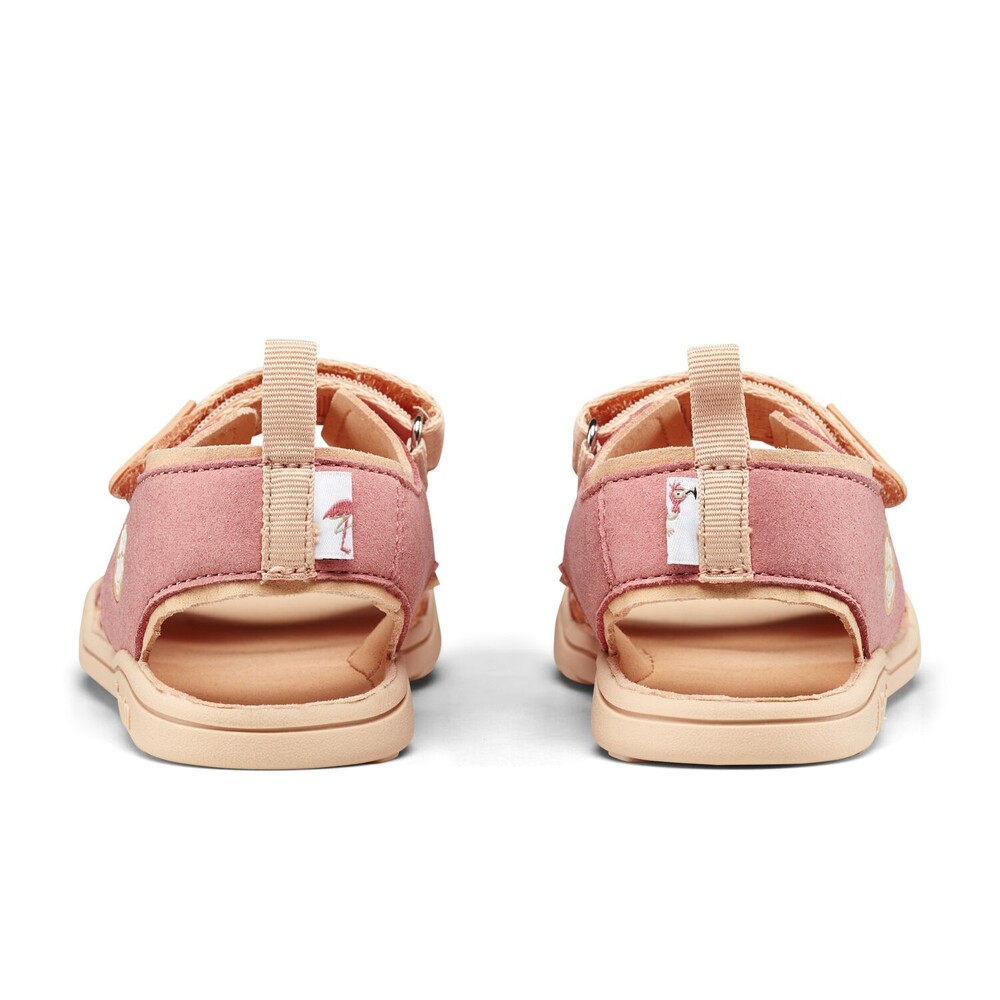 Kengässä on velcro-tarrakiinnitys ja takaosassa eläinaiheiset kangasmerkit, joiden avulla lapsen on helppo pukea sandaalit