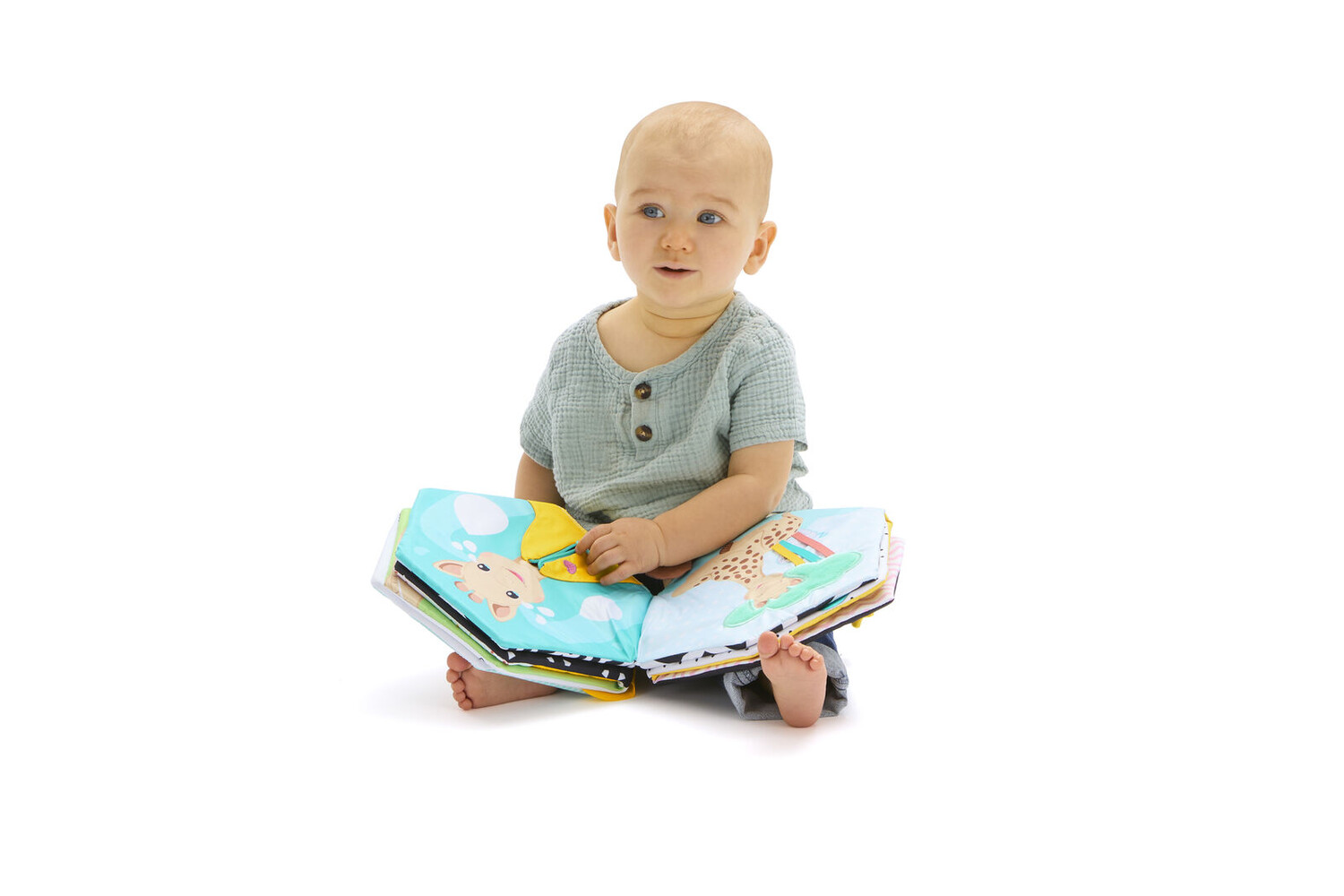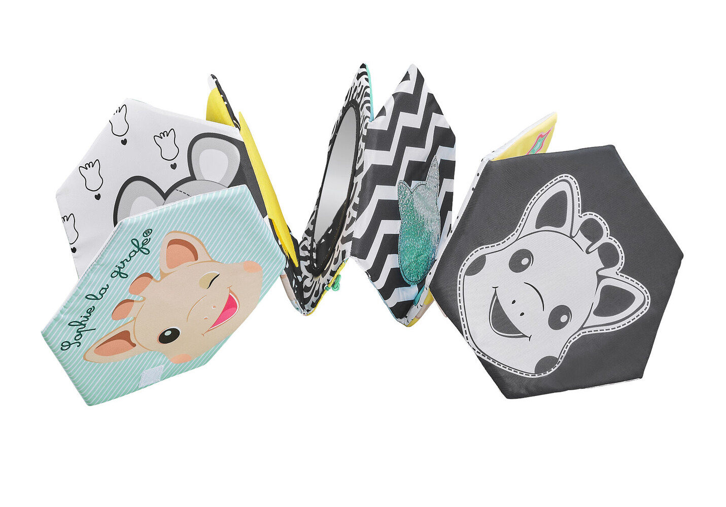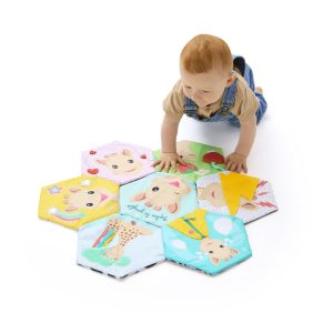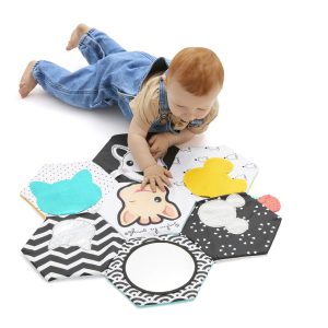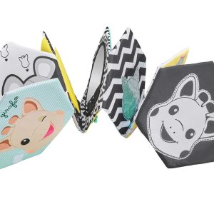This soft fabric book offers more than 10 fun activities to stimulate sight,