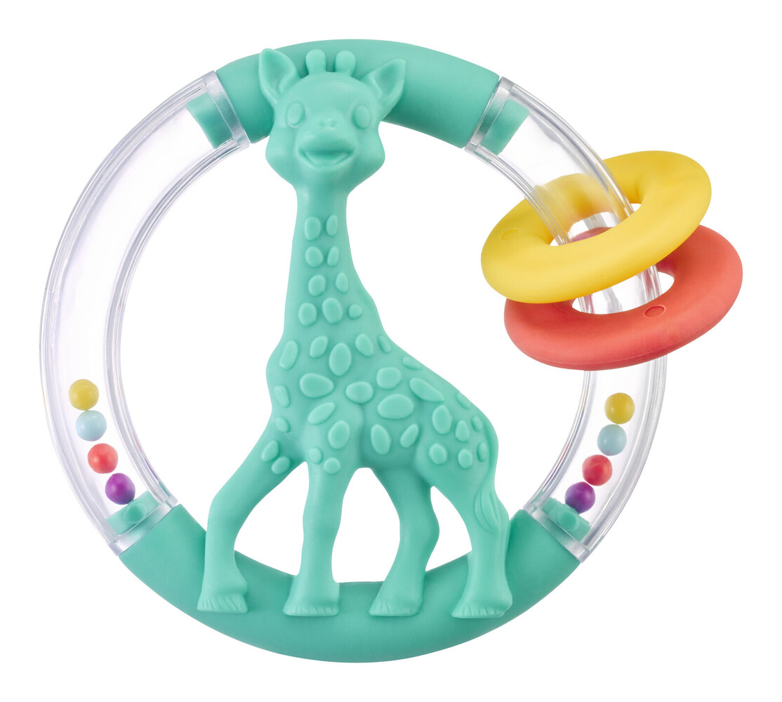 A rattle and a teething ring in one! To discover: Bright colours to attract baby′s attention. Soft and hard textured materials to chew on to soothe sore gums. Sophie the giraffe silhouette in the centre. 2 coloured rings to play with. Little balls to watch clatter together. Easy to grab and handle thanks to the ring.